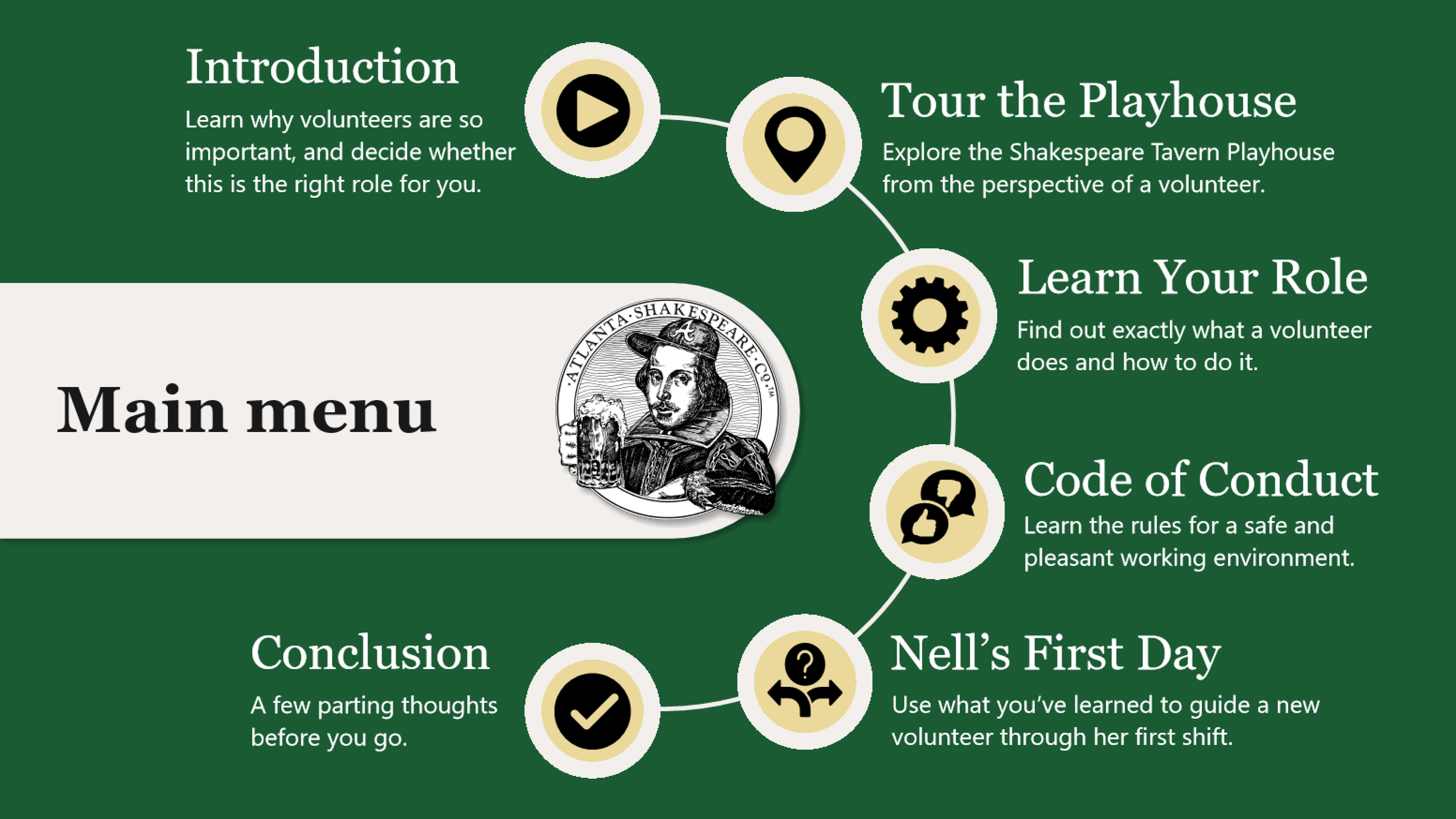 To address these problems, Wonderbite Solutions created an interactive online training that new or prospective volunteers can complete at their own pace before arriving for their shift or even committing to volunteer. The training provides a detailed tour of the public areas of the Shakespeare Tavern Playhouse, describes the volunteer’s role, and explains the standards of behavior in the Volunteer Code of Conduct. By the end of the training, the volunteer is able to explain their role, navigate the Playhouse, and raise any concerns in time for the Volunteer Manager to address them.